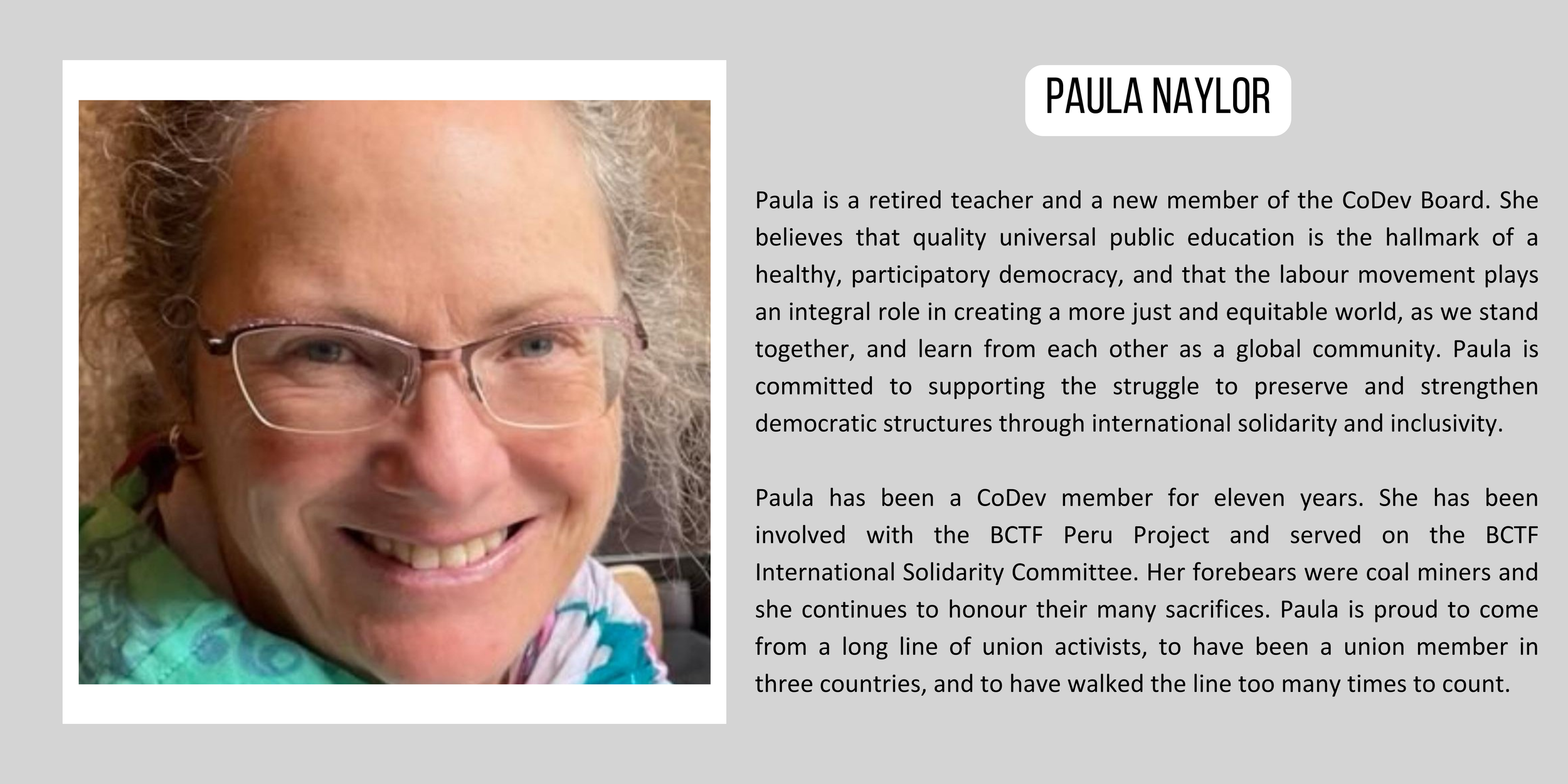 "I was so pleased to join the board of CoDev in the fall of 2010, and I proudly speak of the organization’s ongoing contributions to human rights, labour, women’s and international solidarity work throughout Latin America at every available opportunity. For CoDev, international solidarity is a reality, not a platitude."
